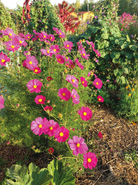 Côté fruits, le couple cultive des framboisiers et quelques fraisiers, « manière de grignoter quand on jardine ». Et côté fleurs, ils laissent pousser des pavots de Californie, des coquelicots, des amarantes et des cosmos (très rustiques et faciles), pourvu qu’ils ne poussent pas dans les rangées de légumes. Ces fleurs attirent papillons et abeilles.