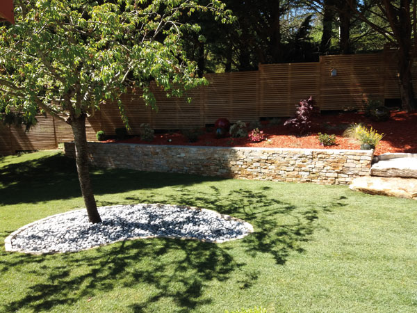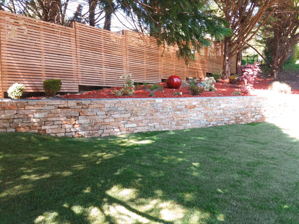 « Je leur ai proposé de casser le talus pour créer deux niveaux bien distincts séparés par une bande minérale. Le niveau supérieur est accessible par deux marches en pierre de 400 kg chacune. » Conçu dans les règles de l’art, le muret de soutien paré de pierre naturelle sépare le massif de l’aire engazonnée. Le haricot créé au pied du cerisier est rempli de galets de granit de très belle qualité et bordé de pierre reconstituée. « J’ai choisi de la pierre reconstituée car c’est un modèle très esthétique, de teinte proche de celle de la pierre naturelle du mur de soutien, disponible en plusieurs tailles et adapté pour dessiner des courbes. »