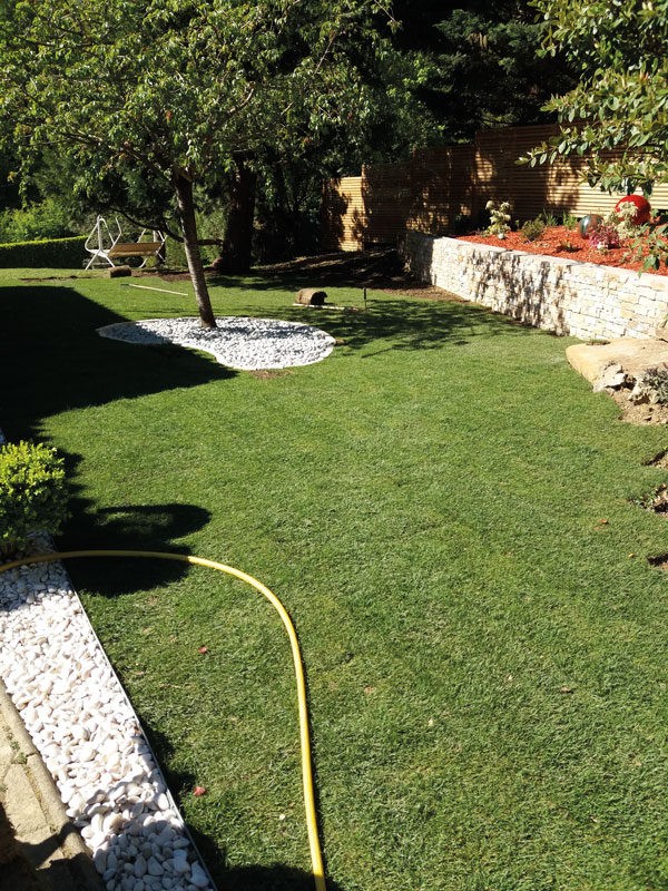 Autour du cerisier, Naturéa a posé des plaques de gazon naturel. « C’est l’idéal. Le gazon est parfaitement implanté, sans mauvaise herbe. Il s’entretien comme un gazon classique avec l’épandage d’un sélectif gazon une fois par an et d’un engrais à dispersion lente pour l’hiver. J’ai aussi installé un petit système d’arrosage automatique qui garantit un gazon vert toute l’année. »