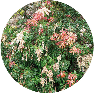 Côté massif, « le sol étant très lourd, très argileux, j’ai apporté 200 kg de terre de bruyère. J’ai sélectionné des végétaux qui supportent l’acidité des conifères (les cyprès de Leyland au-dessus) : érable japonais, graminées (stipas), Andromède du Japon (Pieris japonica), azalée japonaise (Azalea japonica), panic érigé (Panicum virgatum), canche flexueuse (Deschampsia flexuosa), Chasmanthium latifolium. J’ai paillé avec des copeaux de bois colorés. » De superbes boulles de céramique émaillée ont trouvé leur place dans le massif. Enfin, le long de la maison, Fabien Mariou a créé un trottoir de galets de marbre rose qui incorpore les buis existants.