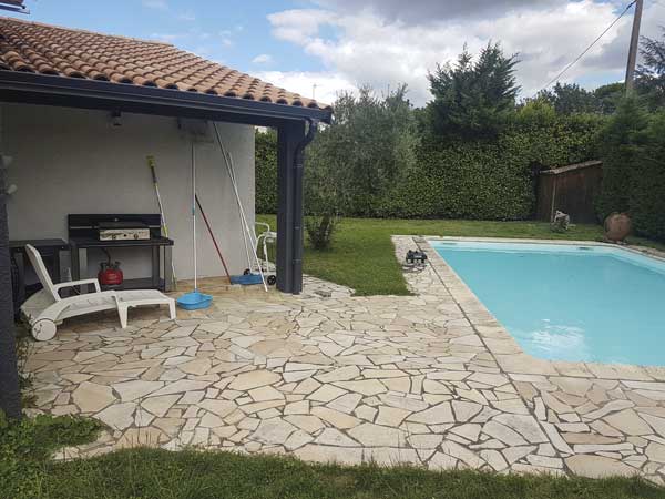 Avant les travaux, le tour de la piscine était en pierre du Lot. Le sol à l’avant de la maison était couvert de cailloux.