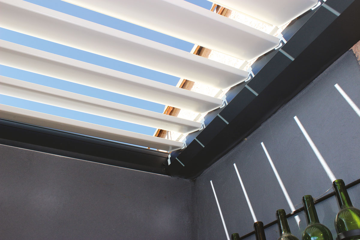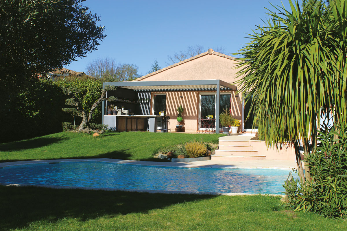 Un vieux store protégeait du soleil la terrasse de cette villa. Le moindre coup de vent nécessitait de le remonter et privait de protection solaire la terrasse et l’intérieur des pièces à vivre. La surchauffe n’était jamais bien loin. Las de cette situation, les propriétaires optent début 2019 pour une pergola bioclimatique. Le projet est confié à DJ Stores. Créée en 2001, la société de Daniel Joubert est réputée sur la région toulousaine pour la protection solaire, les pergolas, fermetures, carports, brise-soleil, moustiquaires, automatismes et la domotique. Le chantier se déroule en février 2019. La pergola, intégralement en aluminium, est dite bioclimatique car ses lames sont orientables. Cela a pour avantage, lorsqu’elles sont ouvertes, de créer une circulation d’air.