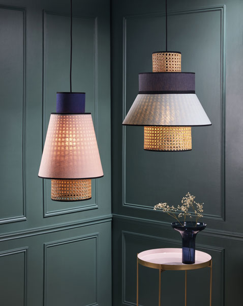 Pari gagné pour les suspensions Singapour GM de Market Set. L’empilement de 3 abat-jour en lin lavé et cannage diffuse une lumière toute particulière.