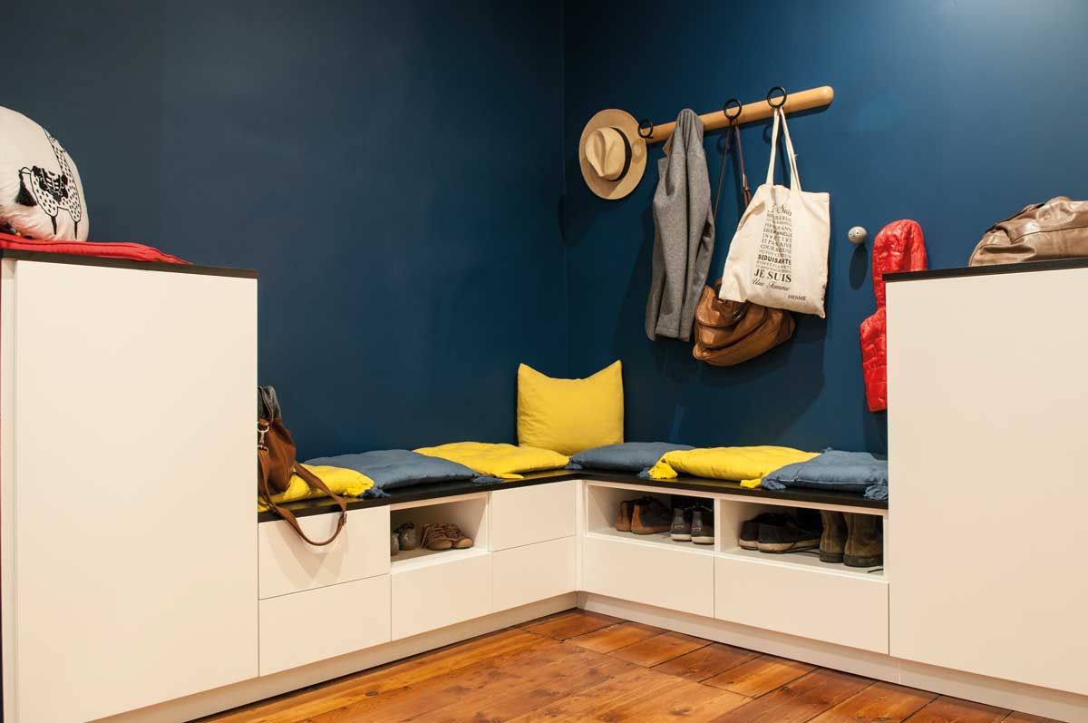 La peinture bleu paon de la collection Sarah Lavoine, chez Ressources (Toulouse) a été réalisée par Laurence Da Silva (Beau Vivre, Toulouse). L’artisan Julien Sansus (Fontenilles) a conçu sur-mesure le meuble de rangement en medium blanc et noir servant également d’assise. Pratique dans une entrée !