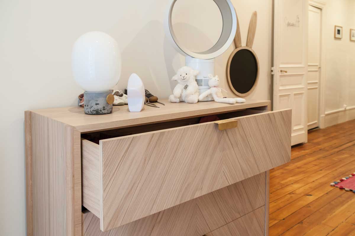 Avant son installation dans ce logement, la petite famille occupait un appartement de 50 m² avec peu de meubles de valeur. Leur entrée dans ce nouveau lieu de vie va de pair avec l’achat de mobilier neuf,
