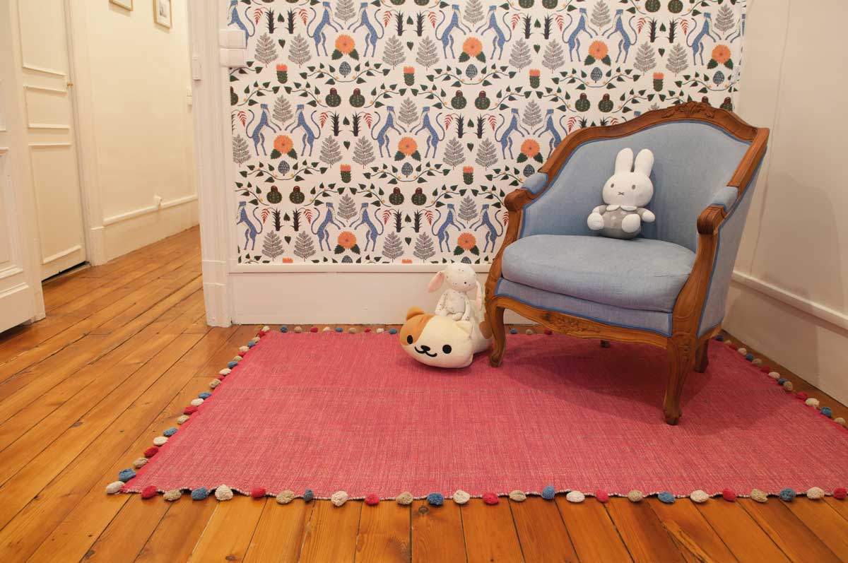 La décoratrice a joué avec un mur en papier peint Au Fil des Couleurs aux animaux stylisés.
