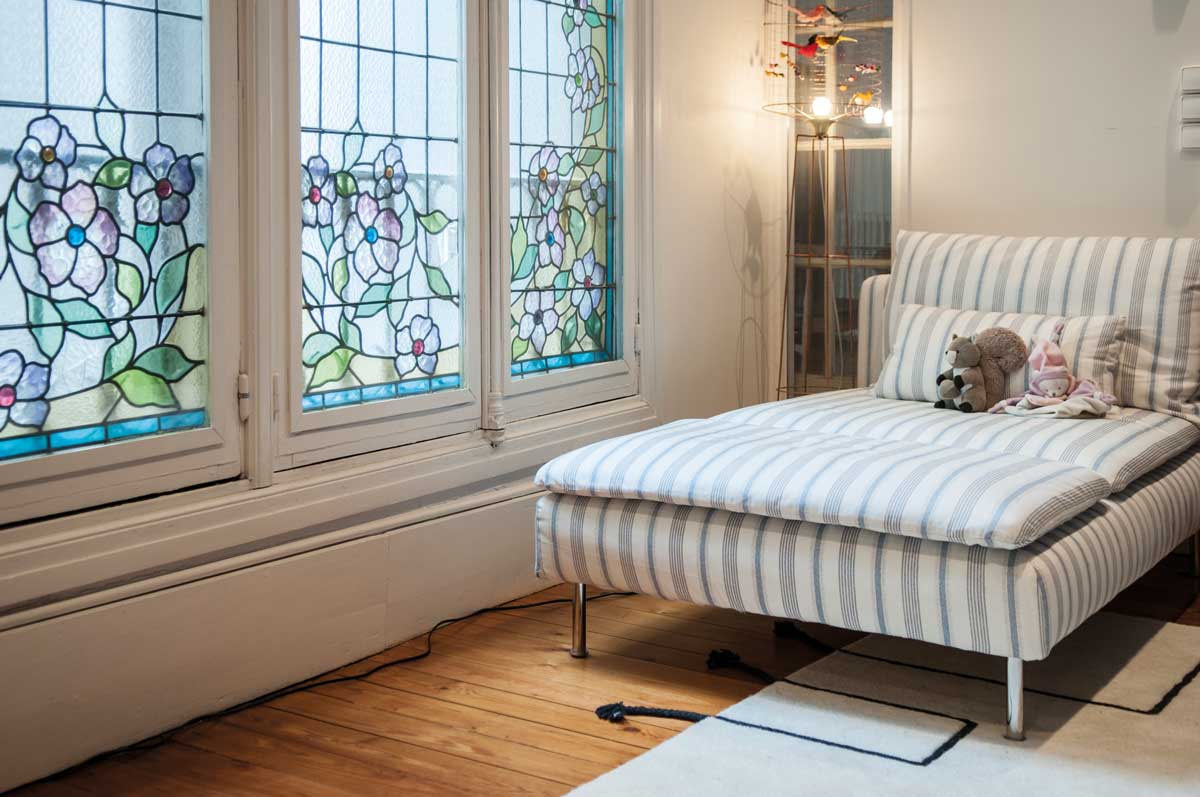 Dans l’entrée, le vitrail aux motifs floraux a donné la base de la couleur pour deux pans de mur de la pièce (bleu paon). L’immense pièce, de 40 m2 environ, supporte une couleur sourde. La housse de la méridienne Ikea, en tissu basque rayé beige et bleu en gros coton, provient de chez Bemz. Ce site propose des housses pour quasiment tous les modèles Ikea. Le lampadaire Mathieu Challières (Schmit décoration, Toulouse) complète la déco.