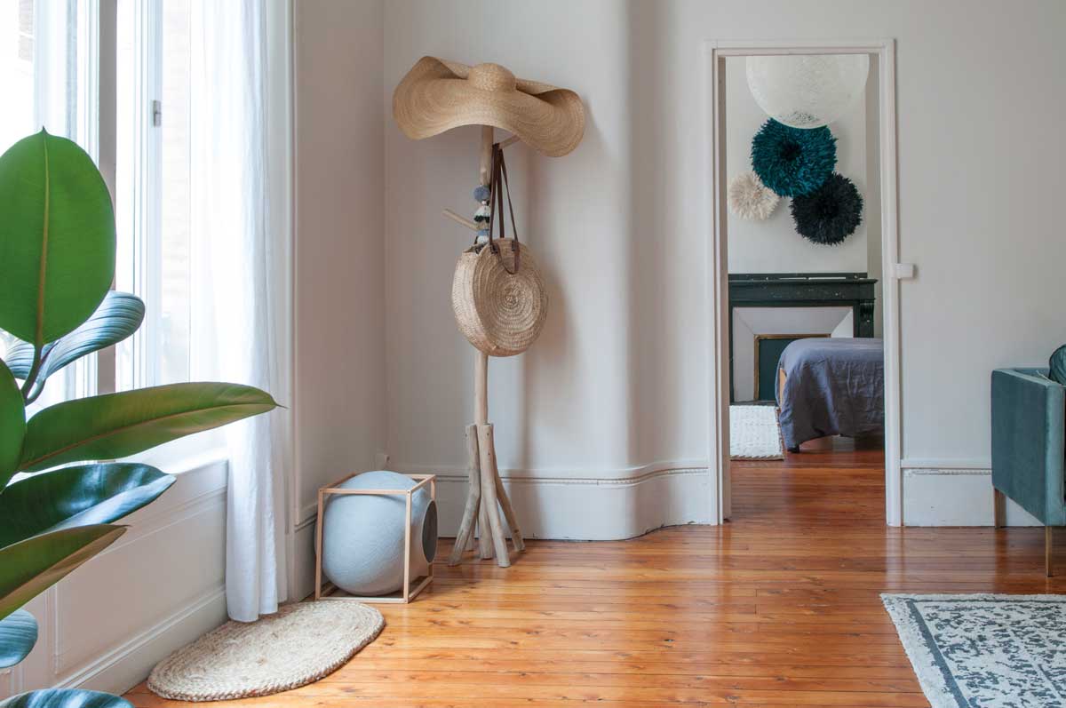 Tout a sa place, y compris le chat. Sur le porte-manteau en bois brut Athezza, superbe chapeau Jacquemus. Boule couchage Meyou pour le chat.