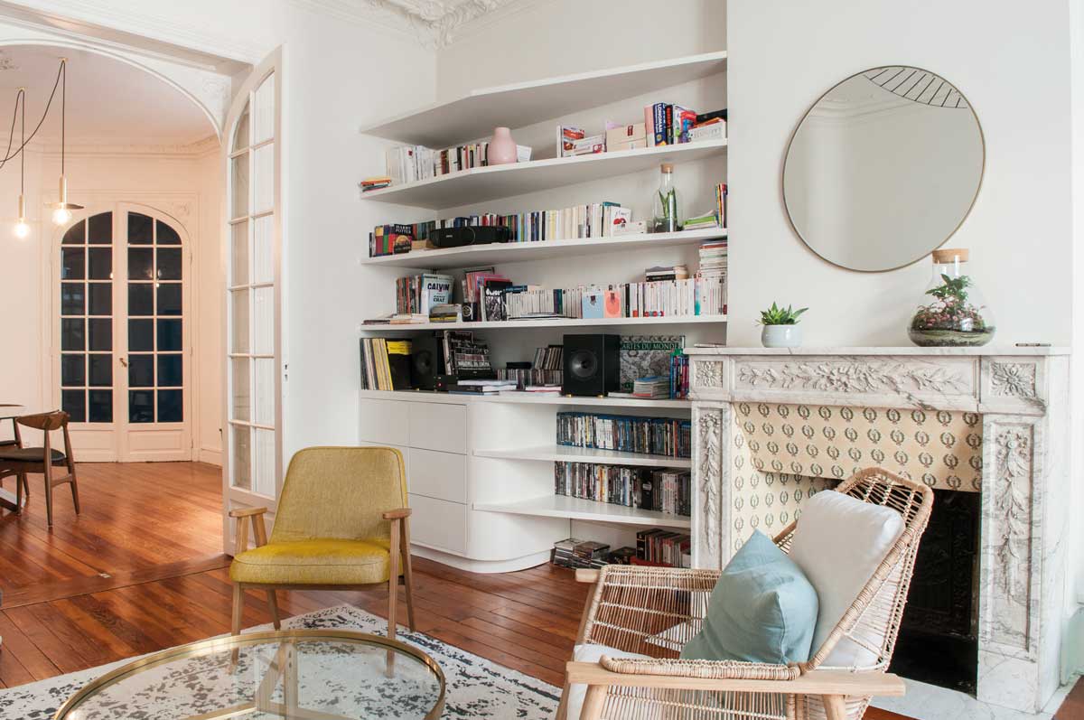 Salon à angles ronds. La cheminée en marbre et faïence avec couronnes de laurier bleu et beige est classée. La décoratrice rappelle les arrondis naturels de deux coins de la pièce en reproduisant la courbe sur le meuble hifi à l’opposé. Julien Sansus (Fontenilles) a réalisé sur-mesure la bibliothèque et le meuble hifi peints de la même couleur que le mur par Laurence Da Silva (Beau Vivre, Toulouse).