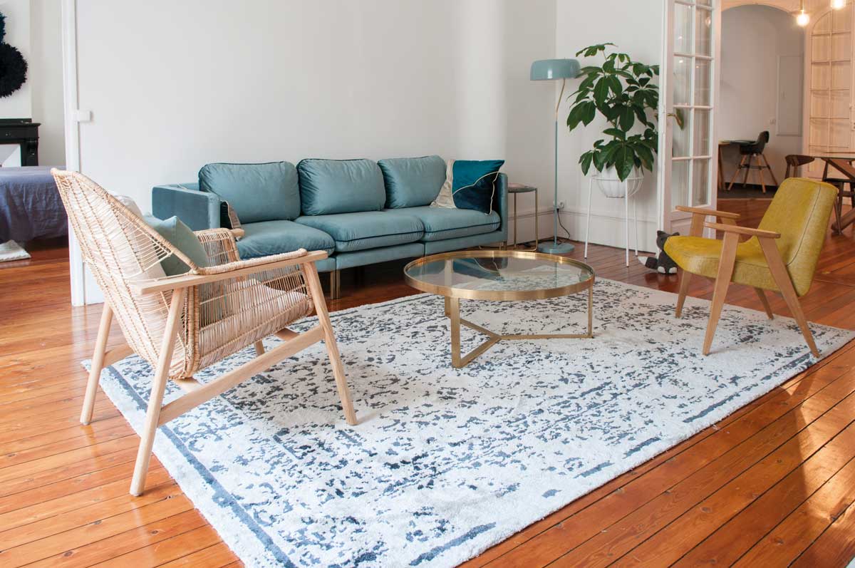 Le canapé 3 places bleu céladon de Maison Père (Paris) se sépare en 3 modules. Idéal pour que chacun trouve sa place lors d’une soirée projection de film. Fauteuil 366 et tapis Toulemonde Bochart (IN EX TOO, Toulouse et Labège). Table basse Made.