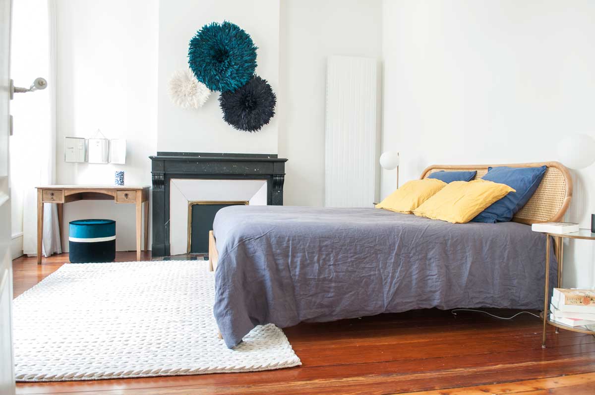 Dans la chambre, lit Made. Au-dessus de la cheminée en marbre noir, le juju hat est une coiffe cérémoniale en plume faite à la main au Cameroun (Maison Marie). La coiffeuse est un ancien bureau de maître d’école des années 1930 chiné sur le site de brocante en ligne Selency. Pouf Sarah Lavoine. Miroir chiné sur Le Bon Coin.