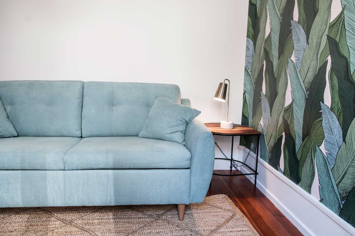 Bureau tropical. Un mur est recouvert de papier peint Leaf de PaperMint, au feuillage tropical dessiné à la main comme une gravure ancienne. Pose du papier peint par Laurence Da Silva (Beau Vivre, Toulouse). Canapé céladon (Convertible contemporain, Toulouse). Tapis jute (Alinéa).