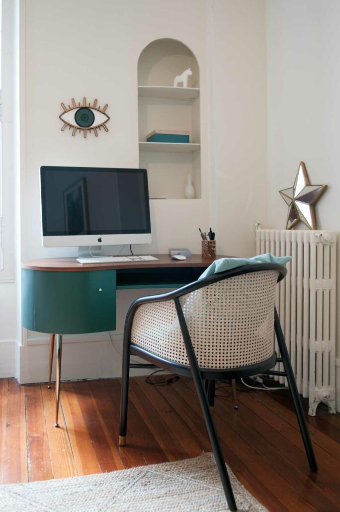 Cannage et rondeur. Bureau La Redoute intérieur vert en forme de haricot, à la fois colonial et art déco. Fauteuil The Socialite Family, vision contemporaine de la chaise à cannage. Œil Umasqu, réinterprétation des masques africains.