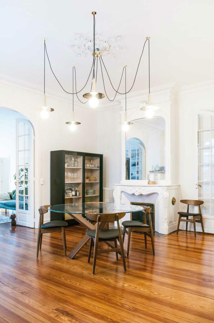 Salle à manger réception. La salle à manger dispose d’un beau volume que Marine Fossé n’a pas voulu alourdir, d’où le plateau en verre de la table Mikado (4-Pieds, Portet-sur-Garonne) et la suspension Spy version 5 branches de Market Set (IN EX TOO, Toulouse et Labège) tout en légèreté. Chaises style années 1950 en noyer. Petit vaisselier Maisons du Monde.