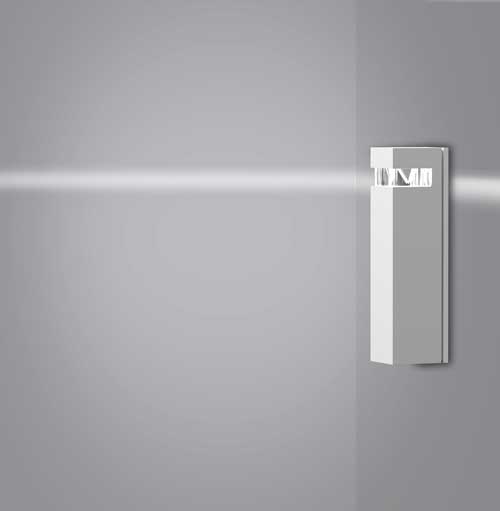 En aluminium et polycarbonate, la lampe murale d’extérieur Walking Graphic dessine un paysage de lumière dynamique. Chez 2B Design (Toulouse).