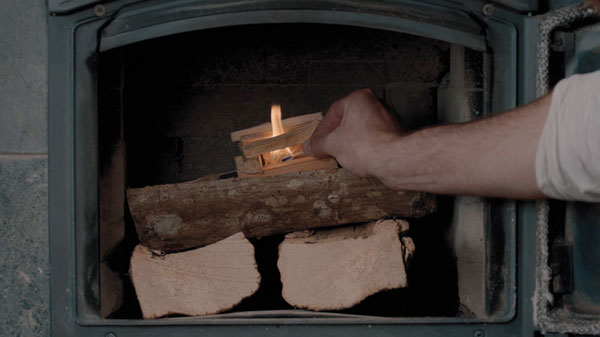 Allumage par le haut. Placez vos bûches dans le foyer et dessus encadrez de bois d’allumage un allume-feu. Photo extraite des tutos de Peter en vidéo sur www.franceboisbuche.com