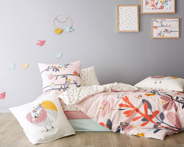 Dans mon arbre. Linge de lit Catimini sur le thème de l’oiseau chanteur. Poésie assurée. Chez Grand Litier (Portet-sur-Garonne).