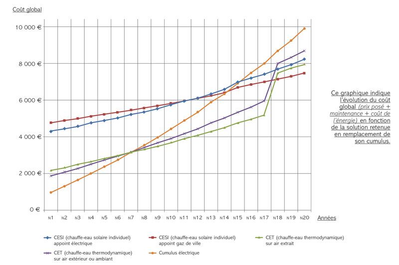 - remplacer le vieux cumulus par un chauffe-eau thermodynamique est la solution la plus avantageuse. Toutefois, la durée de vie conventionnelle d’un CET étant estimée à 17 ans, le coût global du CET bondit la 18e année en raison de l’achat d’un CET neuf.