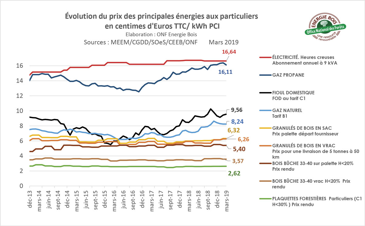 Le combustible bois, les granulés comme les bûches, est une énergie locale au prix stable, non dépendante des évènements internationaux, et bon marché comme le démontre le graphique de gauche.