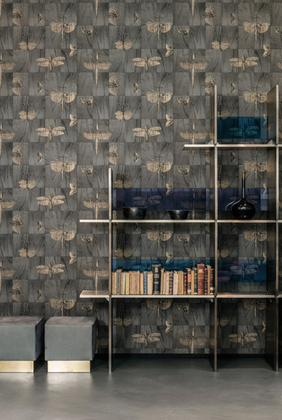 Pour des ambiances de cabinet de curiosité, la collection Ligna mise sur des motifs étranges : insectes, oiseaux en vol, effet bois ou kaléidoscope végétal, pierre marbrière, ou encore effet marqueterie avec filigrane de couleur qui joue avec la lumière.