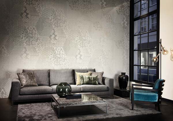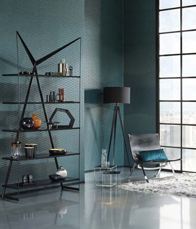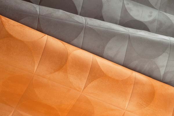 Sa collection Monochrome est basée sur des motifs dessinés par des encres laquées ou nacrées. On obtient des effets cuir, mat très chic, cuivre, moucharabieh.