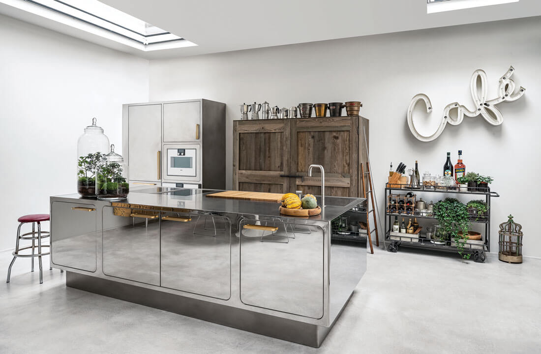La cuisine Ego d’Abimis, un élégant îlot en inox sur-mesure, combine les niveaux de performance supérieurs des restaurants professionnels avec les formes plus élégantes et épurées des cuisines domestiques. Cette cuisine en acier inoxydable est brillante et « lumineuse » grâce à sa finition polie miroir, qui s’accorde aux meubles en bois chaleureux, sculptures en marbre, verrerie, pièces iconiques modernes, luminaires vintage, pour créer un style surprenant et envoûtant. Les portes affleurantes biseautées sont parfaitement intégrées dans la structure et sont associées à de grandes poignées ergonomiques dans une finition en laiton raffinée. Le plan de travail en acier inoxydable, qui abrite également la zone de cuisson et de lavage, est sans joint pour garantir une hygiène maximale et la plus grande praticité.