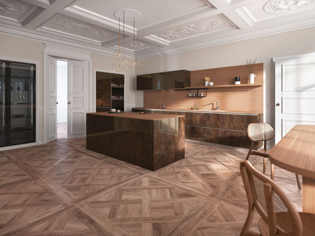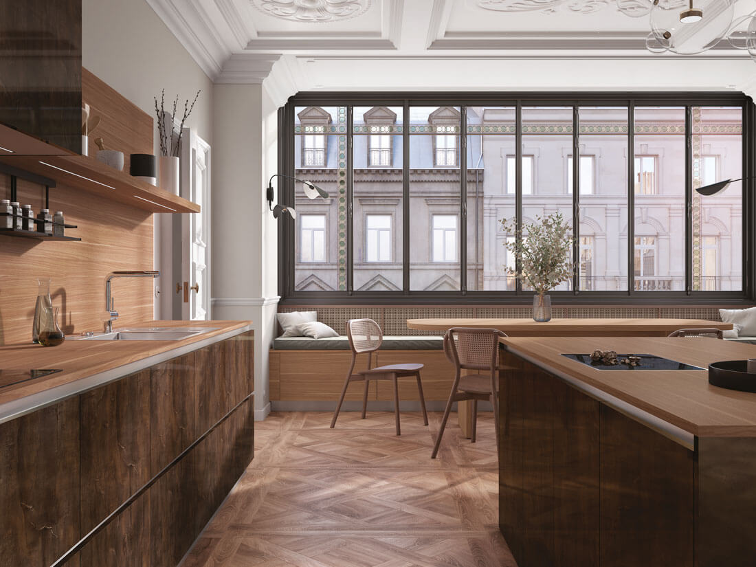 Avec la cuisine Néo Classique, Arthur Bonnet dessine un espace de vie chaleureux et confortable et offre une réinterprétation élégante et raffinée de l’esprit urbain contemporain. Qu’il s’agisse du linéaire ou de l’ilot, les façades en mélaminé brillant coloris « ardoise métallisé doré » donnent le ton. Leurs reflets dorés évoquent les chatoiements d’un acajou roux. Le choix de façades sans poignée et ses deux gorges intégrées (en bas et en haut) renforcent le parti pris d’horizontalité, tout comme la crédence en stratifié décor « bois cannelle ».