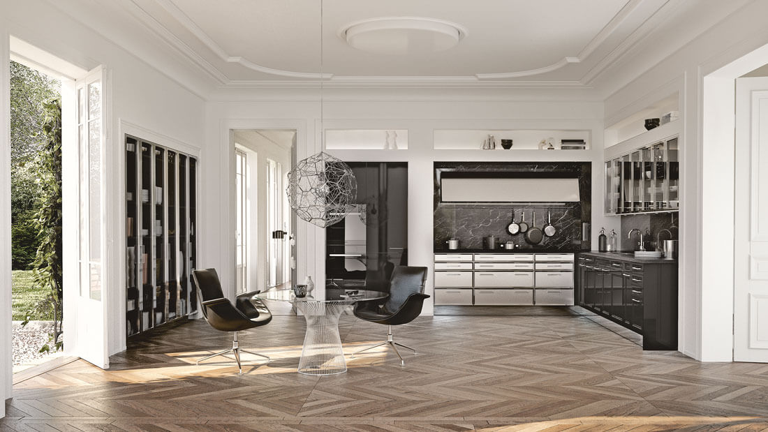 En mariant le granit noir du plan de travail et de la crédence aux façades blanches des meubles bas et à celles vitrées avec un encadrement chromé des meubles hauts, la collection SieMatic Classic explore les matières les plus luxueuses pour finalement les faire résonner les unes avec les autres. Les contrastes sont saisissants et coordonnés.