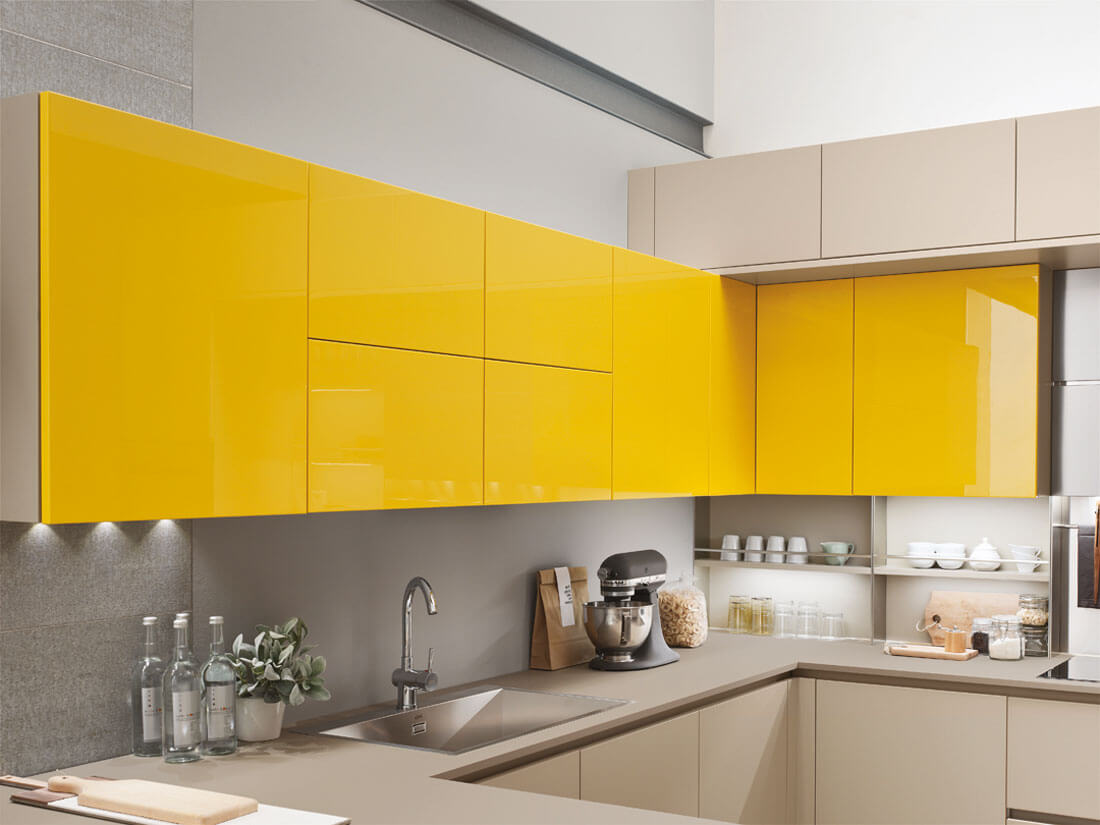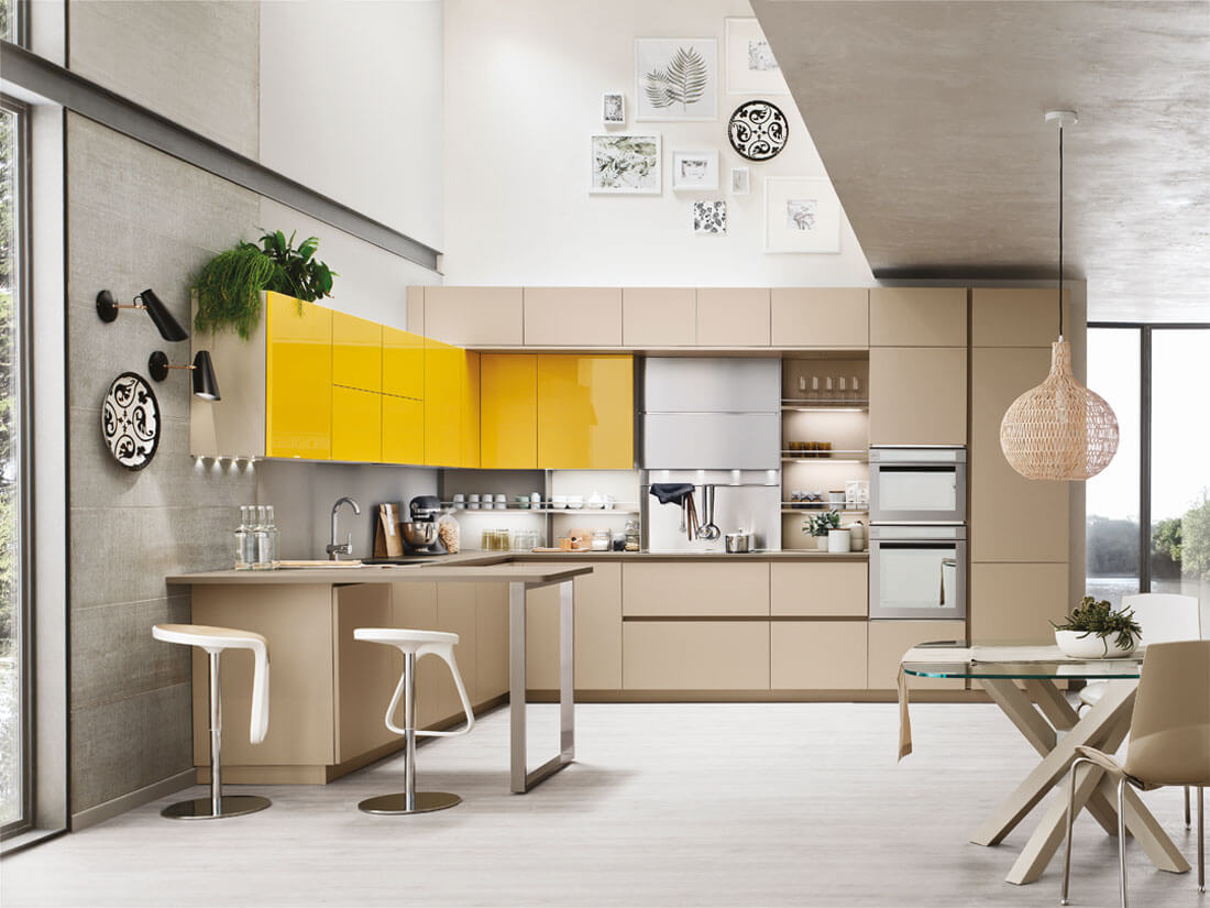 Le fabricant italien Veneta Cucine s’inspire des couleurs Pantone de l’année 2021. Le duo jaune et gris se retrouve dans son modèle Shellsystem. Tendances, design, les façades combinent une laque beige écru mate et une laque brillante jaune. Dans le meuble haut, ouverture à soufflet. La lumière pour illuminer la zone de travail se diffuse par le fond lumineux du meuble haut et par la barre du sous-meuble haut.