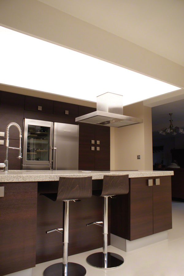 Plafond lumineux. Allumé, le plafond tendu translucide diffuse une lumière d’égale intensité dans toute la cuisine. © Barrisol. 2009. Normalu.