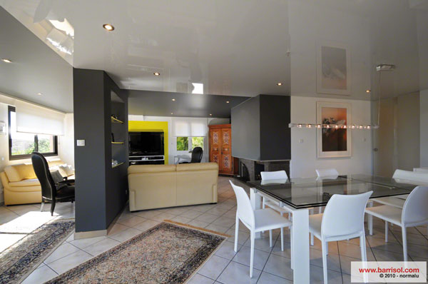 Contrasté. Le plafond tendu blanc brillant de la salle à manger contraste avec le plafond gris mat du salon.