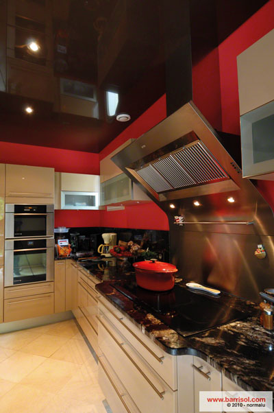 Le plafond tendu noir et brillant de cette cuisine intègre les spots, la hotte aspirante et la bouche de ventilation. © Barrisol. 2010. Normalu.