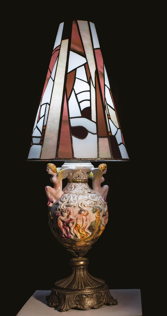 Lampe kitsch réalisée en 2019. Une création à l’allure ancienne qui pourrait néanmoins trouver sa place dans un intérieur moderne. H.70cm.