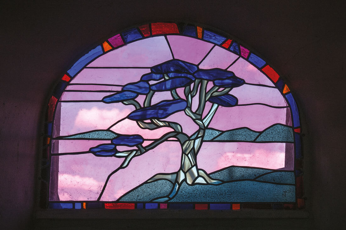 Vitrail à la chapelle Saint Roch de Graulhet. Des teintes violettes subliment ce paysage aux faux airs de paradis.