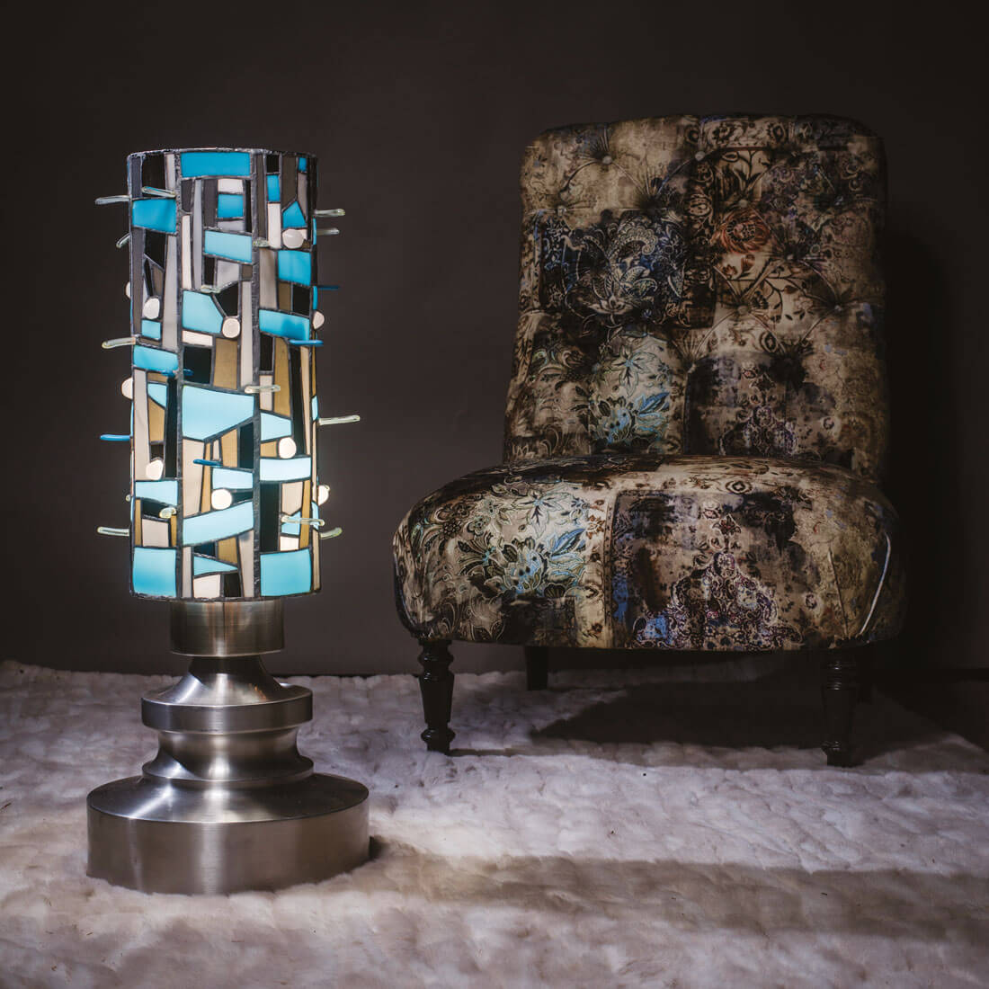 Les bustes partagent la vedette avec les luminaires, chers aux yeux de l’artiste. « Il faut qu’il y ait un équilibre entre la forme, les couleurs, la puissance de la lumière et même l’emplacement de l’ampoule. J’apprécie apporter une touche moderne via mes créations bien que les matériaux soient anciens : verre colorée, étain, métal et cuivre. »
