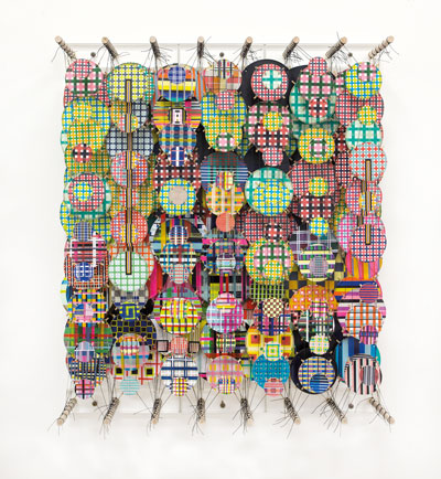 Œuvre de Jacob Hashimoto. Fragments of the Sun Frozen in this Strongly Fretted Light, 2017. Acrylique, papier, bambou, bois et Dacron.