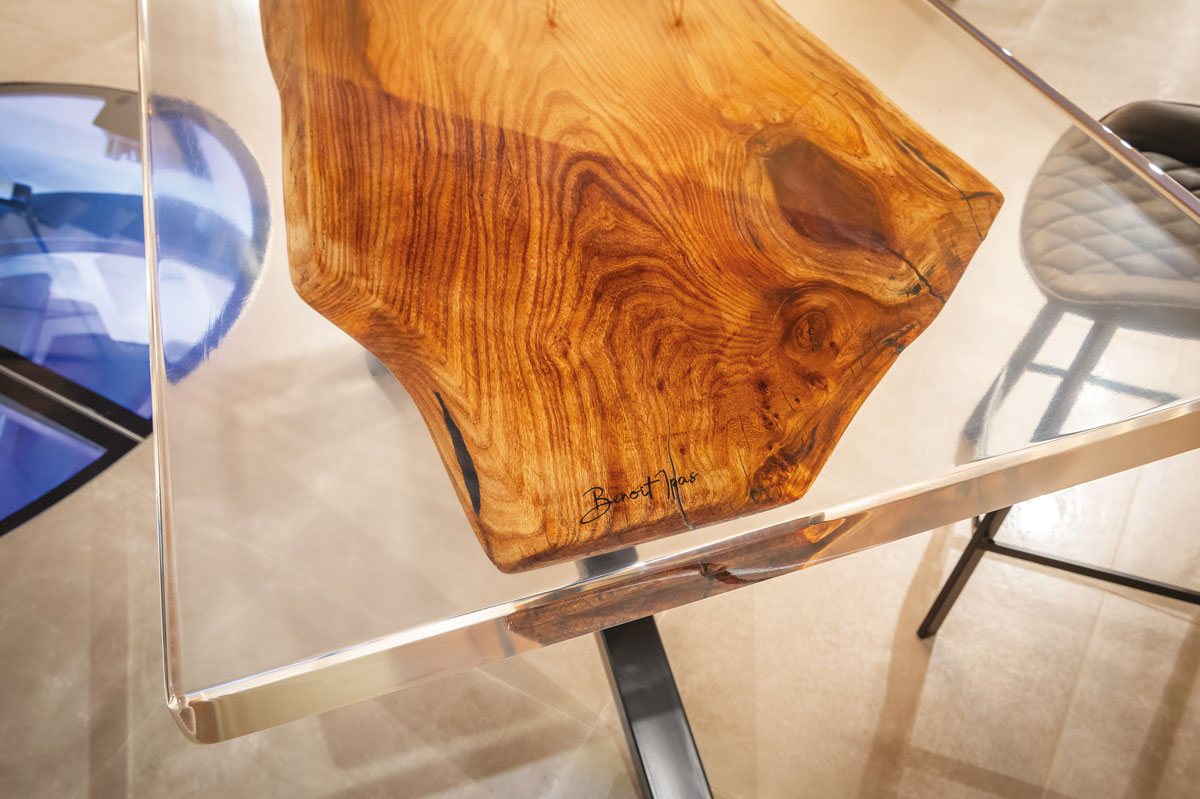 « Cette table est le plus gros de tous mes projets réalisés à ce jour », prévient le designer toulousain Benoit Ipas. « Les tables en résine sont très en vogue outre-Atlantique. J’ai voulu sortir du lot grâce à mon savoir-faire dans la résine et également montrer qu’il est possible de réaliser une pièce unique et raffinée. La fabrication du plateau commence avec un choix très sélectif de l’essence de bois, j’ai choisi une magnifique planche en orme massif. C’est une essence réputée pour ses propriétés similaires à celles du chêne, son veinage très marqué, mais également par sa rareté.