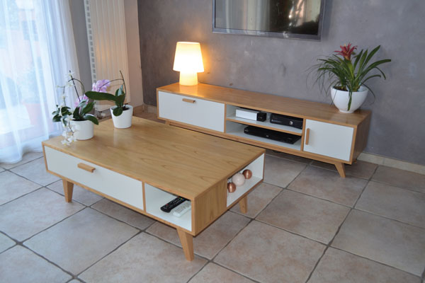 Table basse et meuble TV réalisés par l'ébéniste Cécile Barra pour un client.