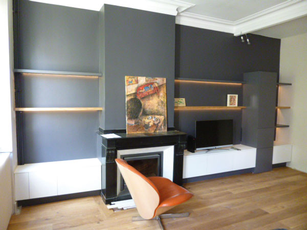 Rangements et étagères réalisés sur-mesure par l'ébéniste Cécile Barra.