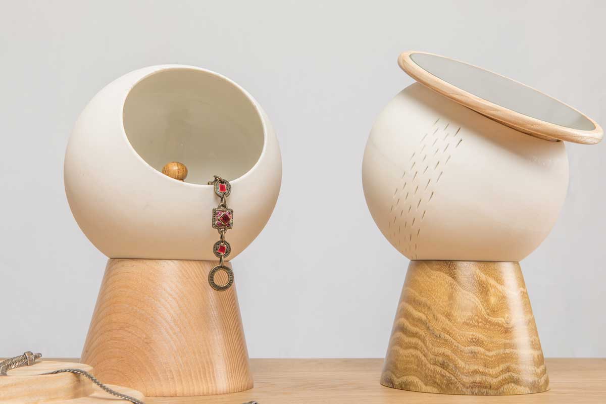 Boîte à bijoux miroir « Eve » en frêne et porcelaine.