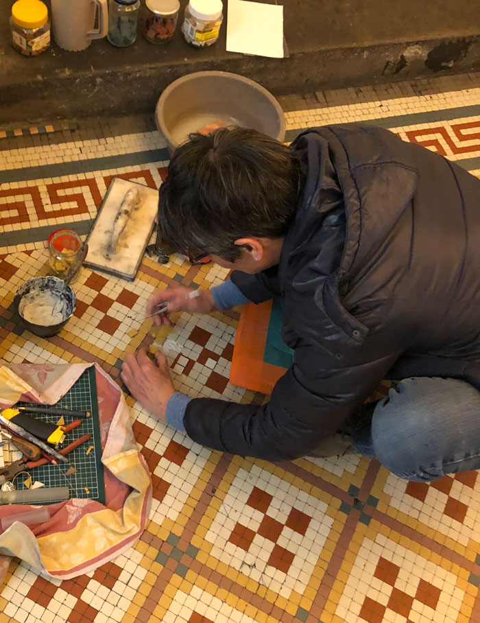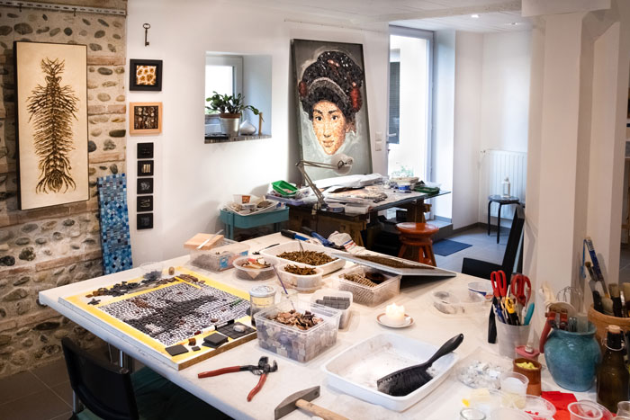 « C’est mon antre, l’endroit dans lequel je travaille et je m’épanouis à créer. J’ai besoin d’ordre pour travailler et dans ce métier il y a beaucoup de matières différentes telles que la pierre, le verre mais aussi des matériaux de récupération que j’ai tous répertoriés et classés afin d’y accéder aisément.