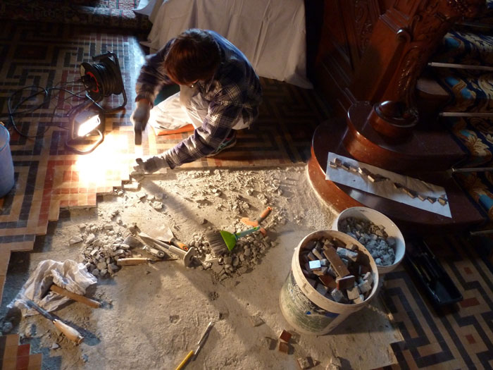 La mosaïste s’éloigne aussi de son atelier pour rénover des lieux exceptionnels : le Château de Valmirande de Montréjeau, la Cathédrale Sainte-Cécile d’Albi, l’Hôtel Mercure Plaza à Biarritz… « Quand j’arrive sur place, je commence par identifier les matériaux. Ensuite je note les zones manquantes et les nettoie avant de calquer les formes vides. Je retourne dans mon atelier pour recréer les pièces les plus grandes et enfin je me rends de nouveau dans le lieu pour les poser. » Un travail aussi minutieux que plaisant pour la Seyssoise. « À l’avenir, ce que j’aimerais c’est de pouvoir partager avec mes collègues un beau et grand projet, parce que pour moi la collaboration et le partage sont enrichissants et épanouissants. »