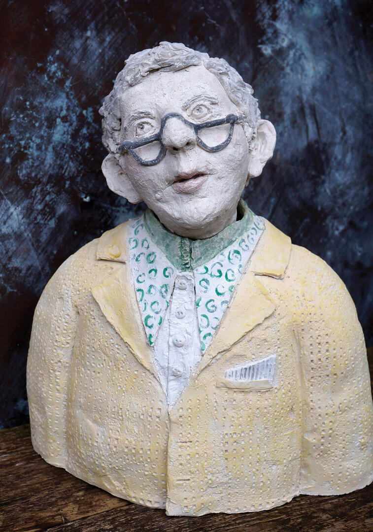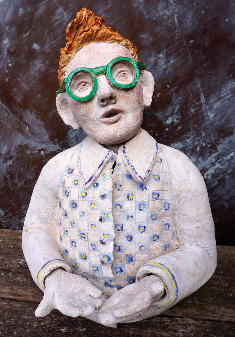 « Un peu de rousseur », série Colorama, 2019. Ce personnage haut en couleurs se distingue par ses cheveux roux et ses lunettes rondes vertes. H.40cm.