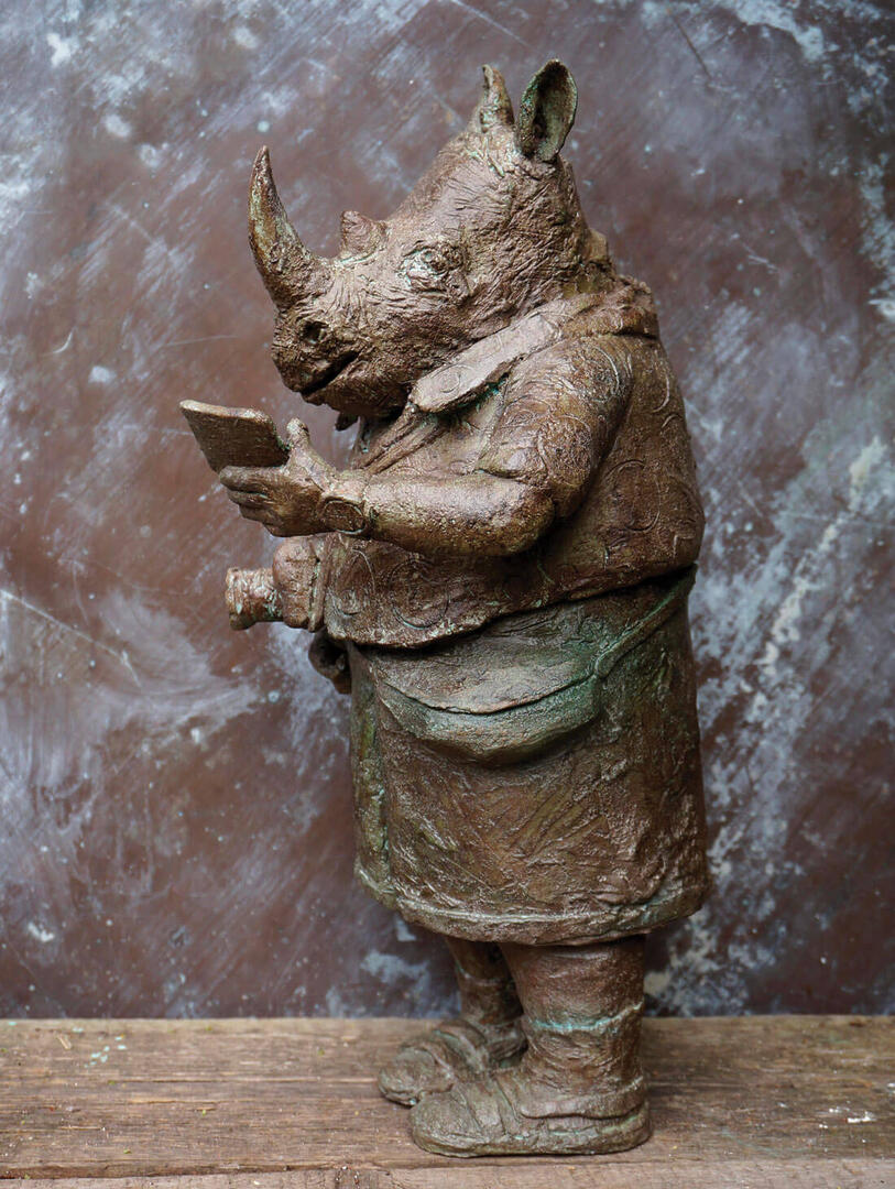 « Monsieur Rhinocéros », série Manimal, 2021. L’artiste a utilisé une patine façon bronze pour donner un aspect vieilli à cette pièce unique et sauvage.