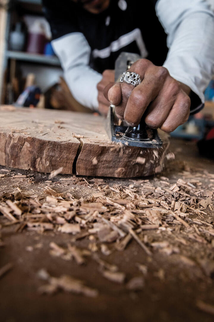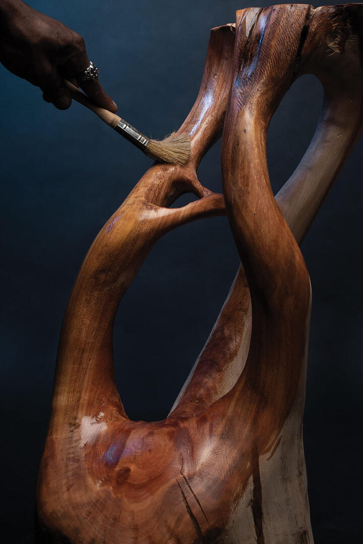 Chêne, noyer, châtaignier, platane, cèdre… Boris Ndjantou ne recule devant aucune essence, qu’il façonne entre huit et dix semaines pour donner naissance à une table. « J’essaye avant tout de faire émerger des formes naturelles à travers les pieds du meuble. J’ajoute parfois de la résine, qui est locale et organique à 50 %, pour renforcer le côté artistique. »