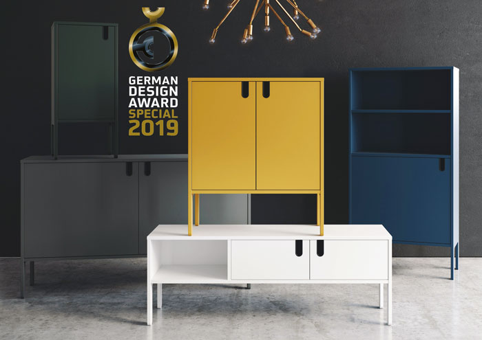 Collection de meubles en MDF laqué Uno de la marque suédoise Tenzo. Récompensée du German design award spécial 2019. À gauche, luminaire LMP Galant pour Flam&Luce en métal et tissu. H.205cm.