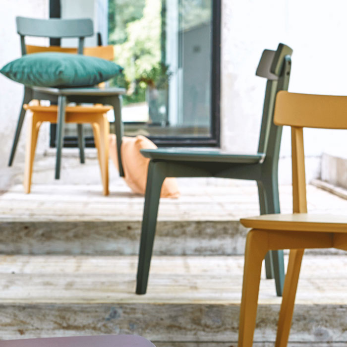 Chaise Suzy de chez Alinéa. 2019. Assise (épaisseur 25mm) et dossier (épaisseur 18mm) en panneau de fibres de moyenne densité. Structure et piètement en hévéa massif, avec chanfrein.