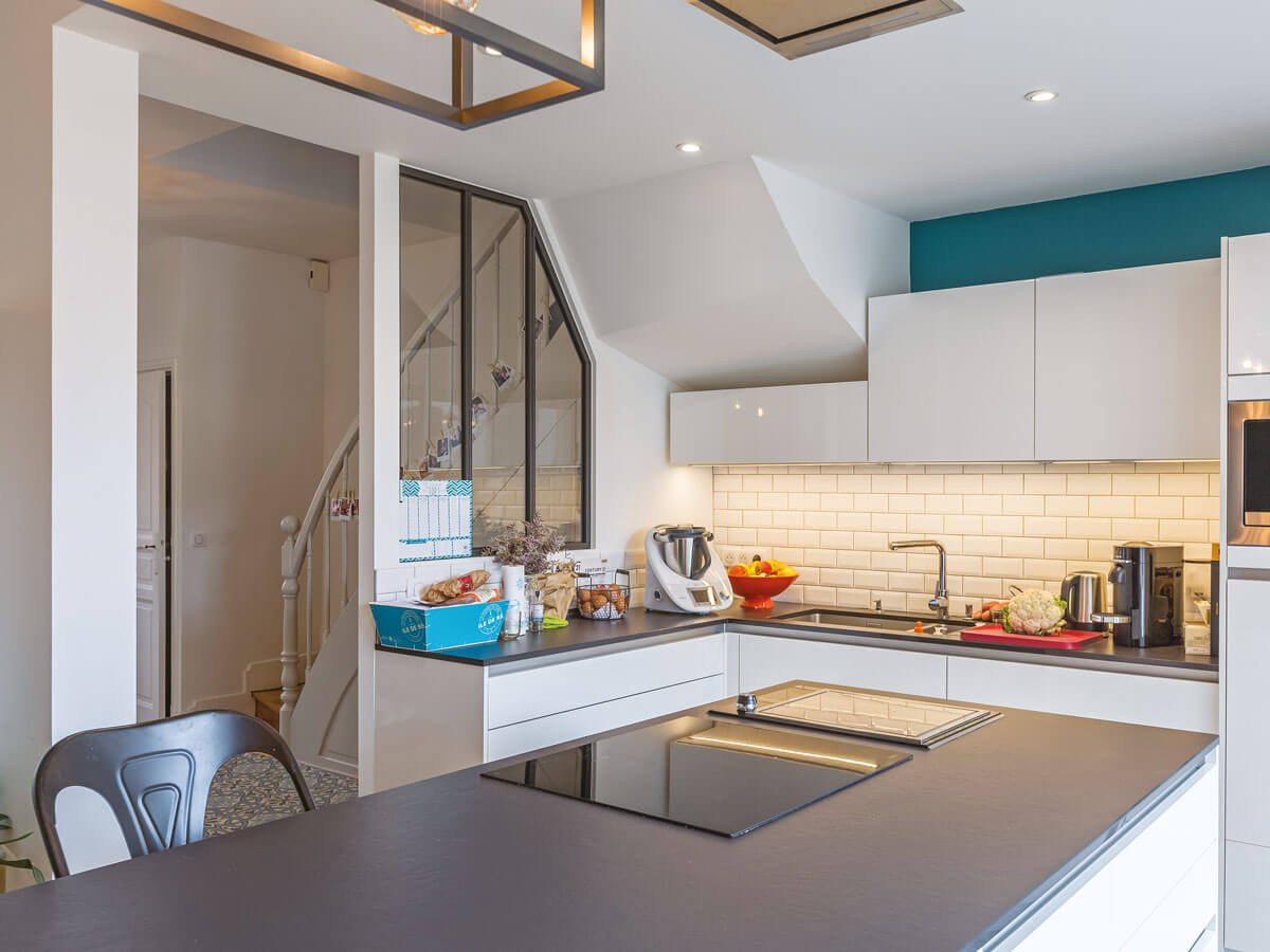 L’entrée gagne en volume et en clarté, une verrière la sépare de la cuisine, qu’une baie vitrée baigne de lumière. Le salon est une grande pièce sur laquelle déborde l’îlot central de la cuisine. Le premier étage compte une chambre avec salle de bains pour chaque enfant. Le second niveau, surface habitable créée après surélévation de la toiture, permet la création d’une suite parentale avec dressing, bureau, chambre et salle de bains.