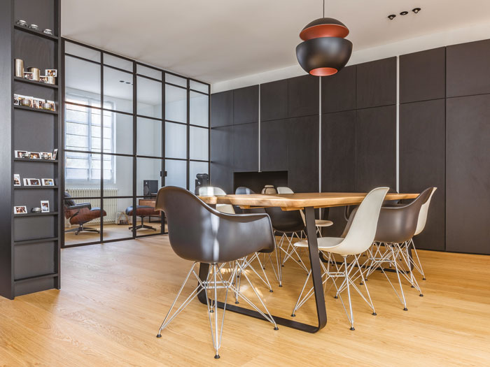 Univers science-fiction. Les teintes neutres et sombres forment un duo sobre imaginé par l’architecte toulousain. Les murs sont en stratifié de chez Egger et le parquet est un contrecollé en chêne. Autour de la table à dîner, belle collection de chaises et fauteuils designés en 1950 par Charles et Ray Eames pour Vitra. Les piètements chromés créent un jeu métallique futuriste original. Suspension Here comes the sun, designée par Bertrand Balas en 1970, en aluminium.