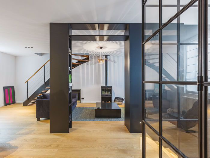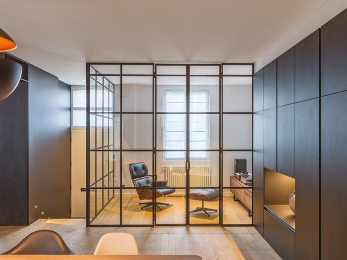 Boîte à musique. La verrière permet de se ressourcer en isolant l’espace de la pièce à vivre. Clément Fabre a souhaité que les montants en acier soient montés à l’envers : « Cela permet de voir les fixations qui ajoutent une touche industrielle. » Luxueux et accueillant, grand classique du design, le Lounge Chair Eames et l’ottoman en cuir de Charles and Ray Eames pour Vitra.